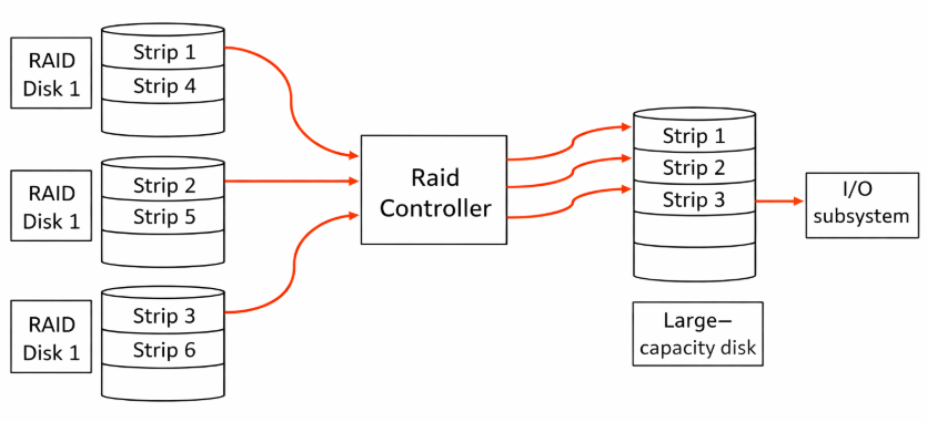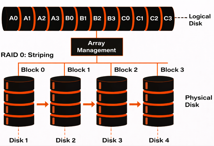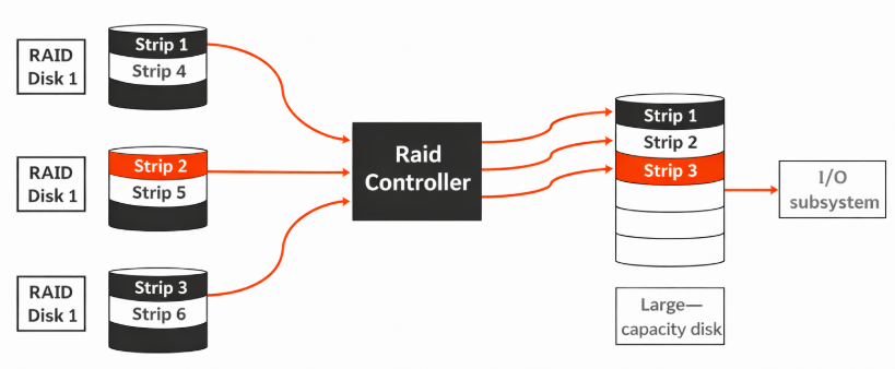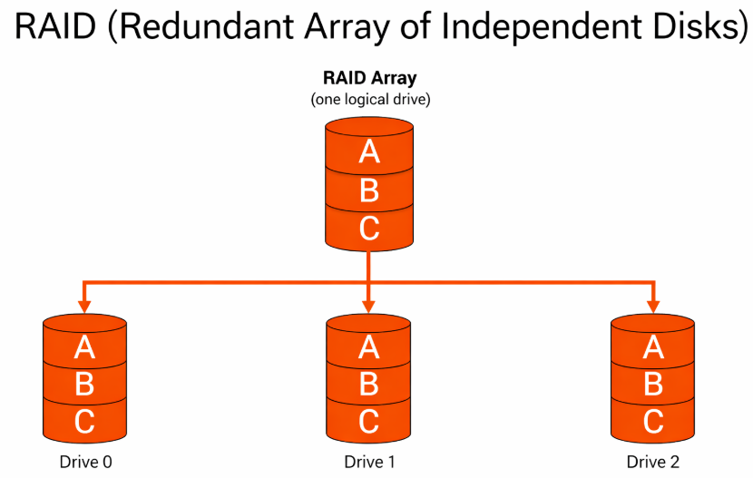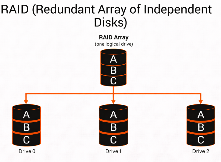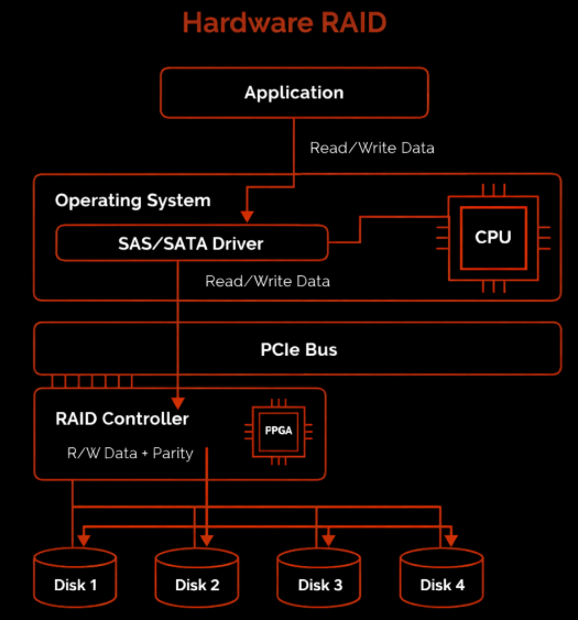 Hardware RAID uses a dedicated RAID controller that abstracts multiple disks into a single logical device. The operating system sees this as one disk and has no direct visibility into the individual drives.
