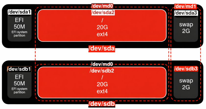 - GRUB must be installed on both disks to ensure bootability after a disk failure