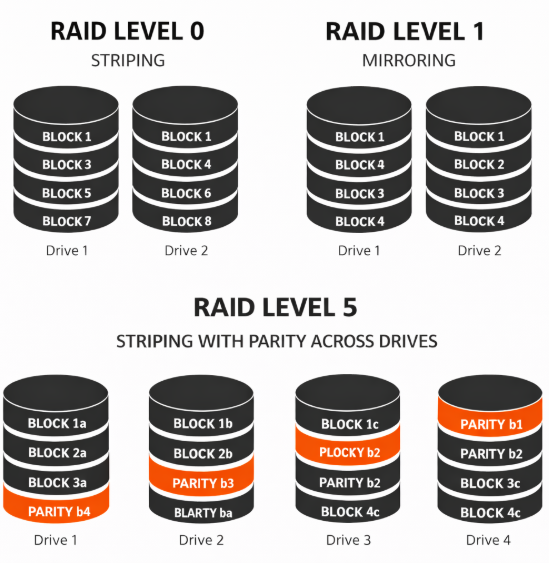 Hardware RAID is often used in standardized enterprise environments, but it reduces portability and visibility.